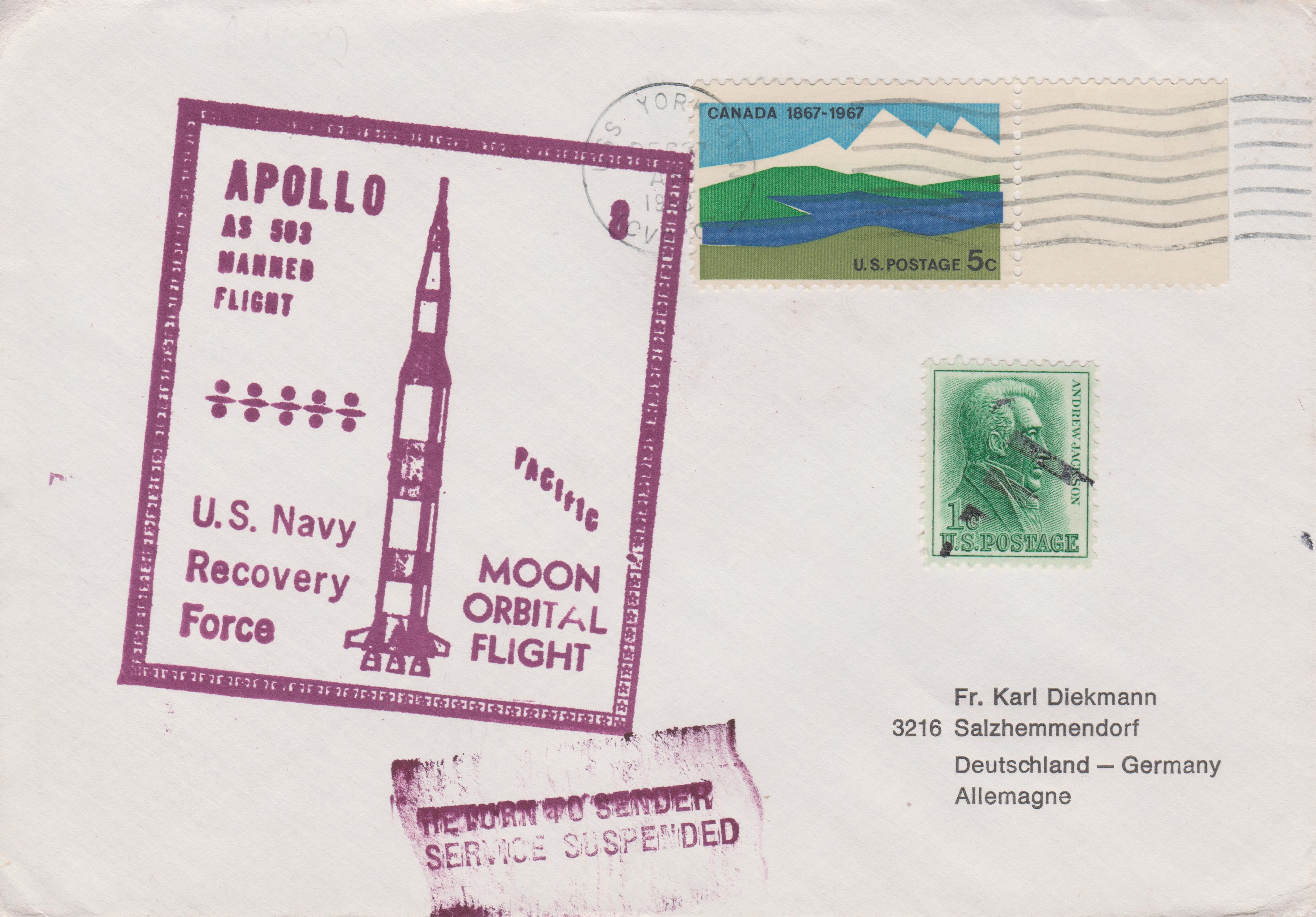 Dieser Beleg mit Stempeldatum 21.12.1968 dokumentiert den Verlauf der APOLLO 8-Mission vom Start am 21.12.1968 bis zur Landung am 27.12.1968: