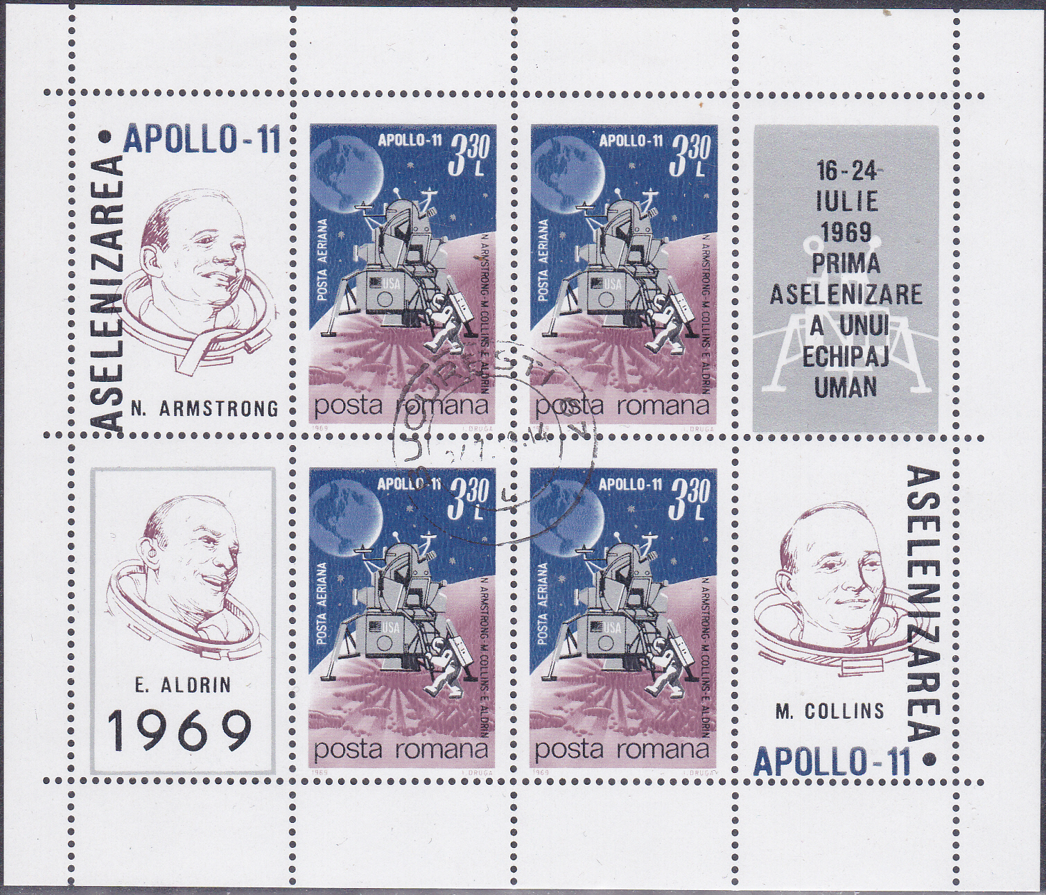 Aus Rumänien kommt diese Marke (MiNr 2781) zur ersten bemannten Mondlandung Apollo 11. Sie zeigt die Mondlandefähre von Apollo 11 auf der Mondoberfläche, einen Astronauten und die Erdkugel.