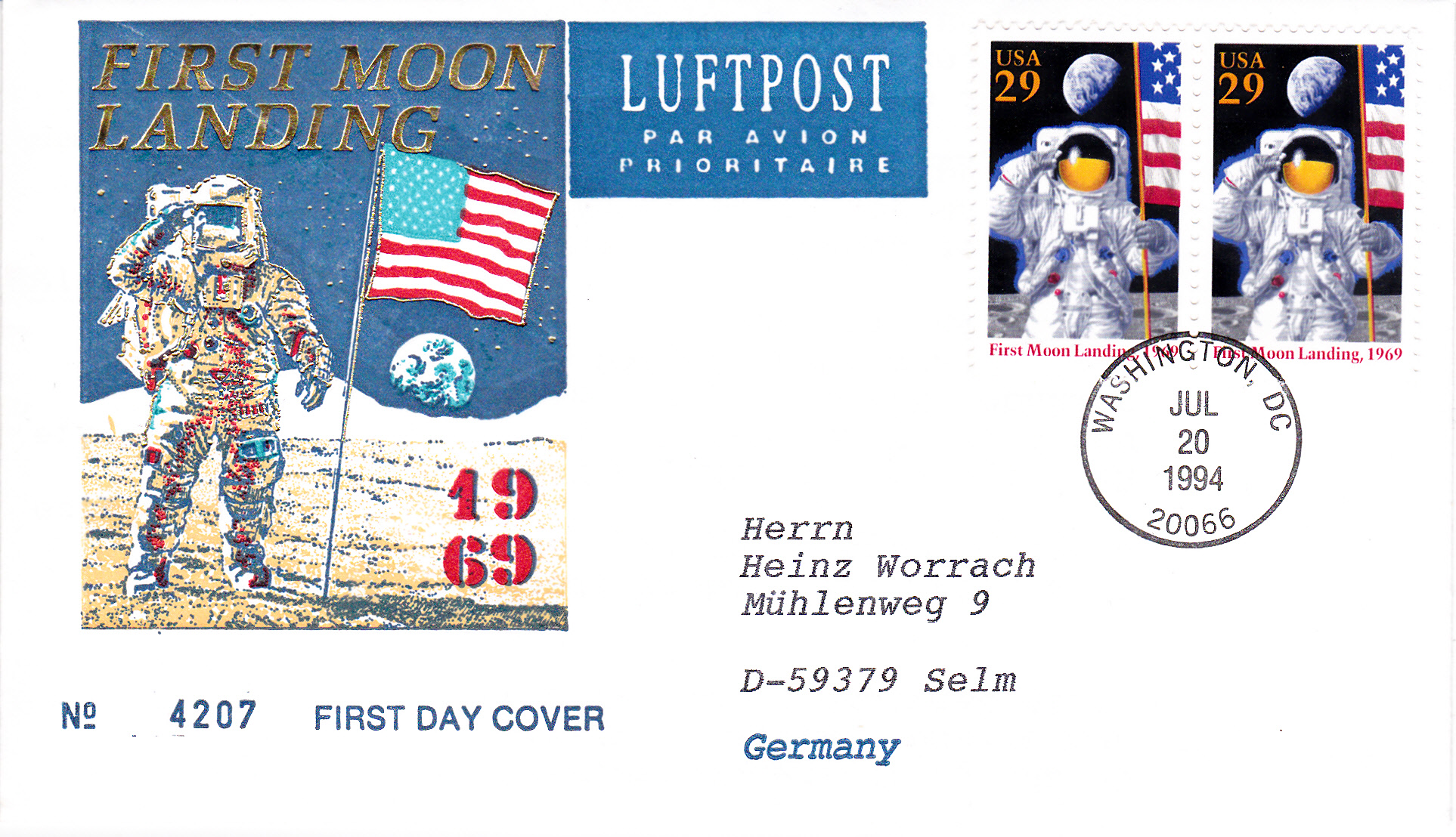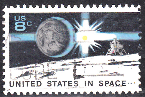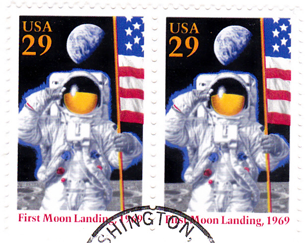 In den USA erschienen im Jahre 1994 zum 25. Jahrestag der ersten bemannten Mondlandung zwei Marken. Im Markenbild wird ein salutierender Astronaut mit US-Flagge auf dem Mond gezeigt.