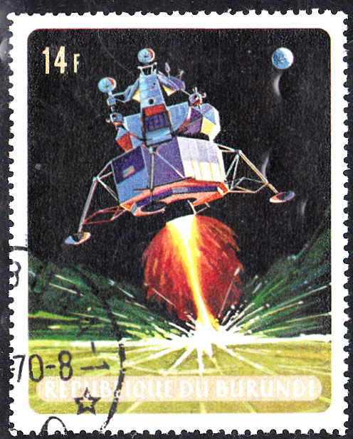 In Dubai gab es ebenfalls eine Markenausgabe zur ersten bemannten Mondlandung durch Apollo 11. Auf dieser Marke (MiNr 363) sehen wir einen Astronauten beim Verlassen der Mondfähre.