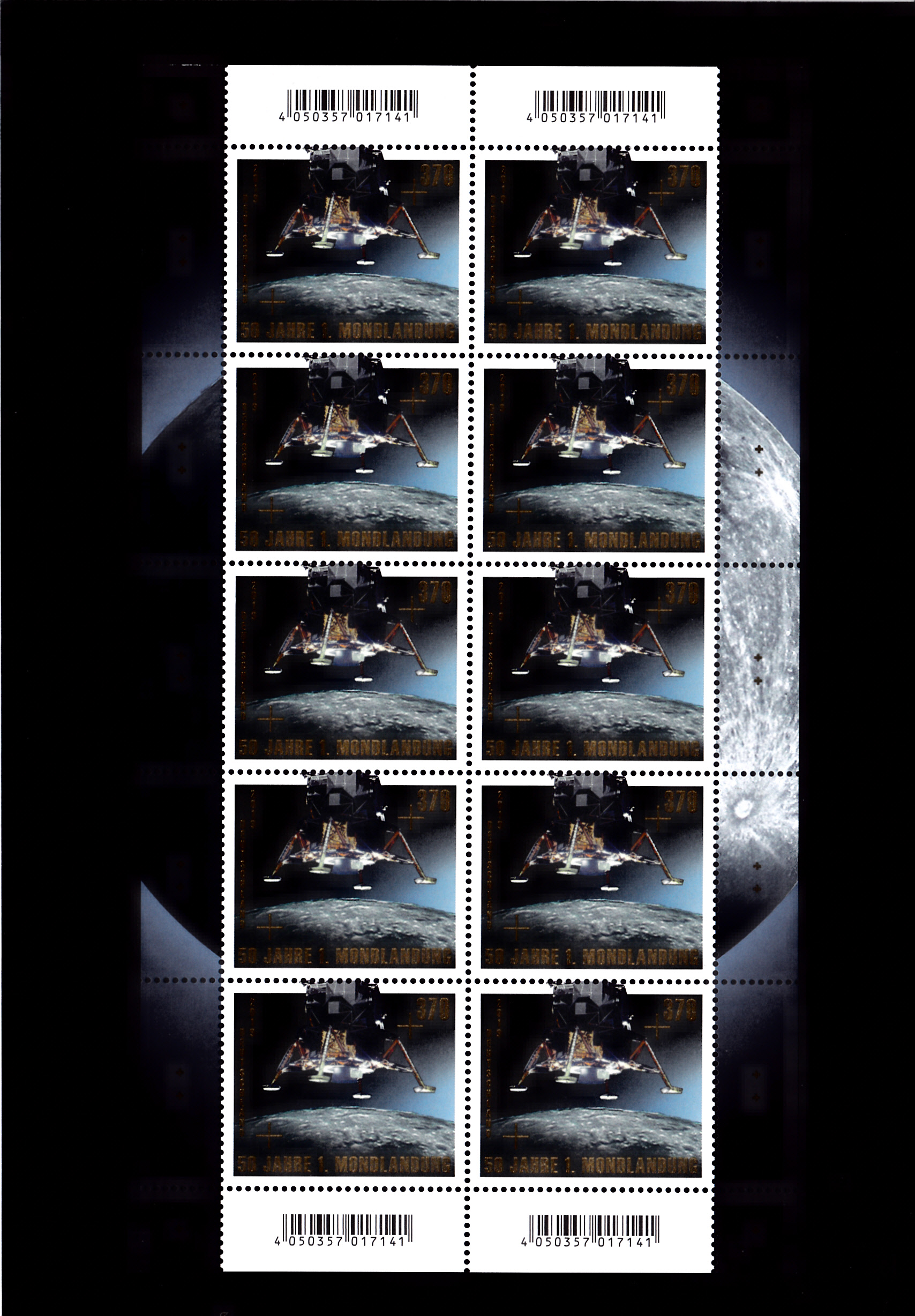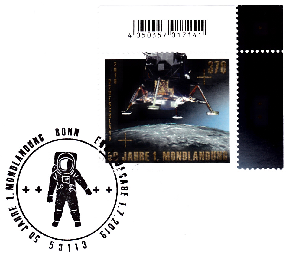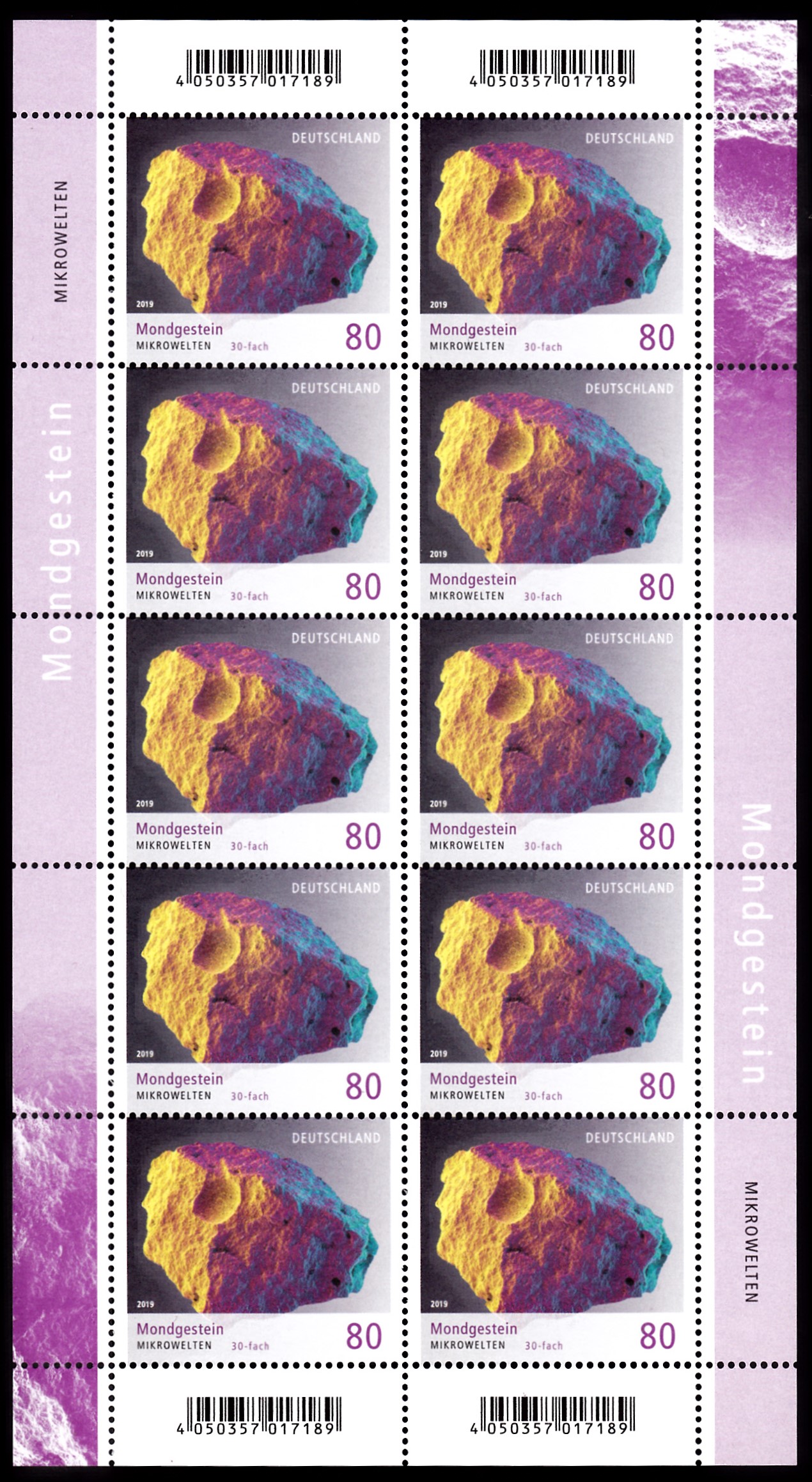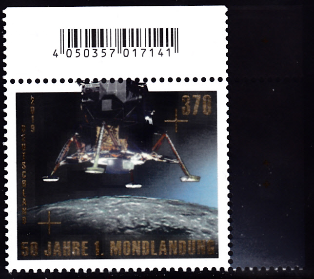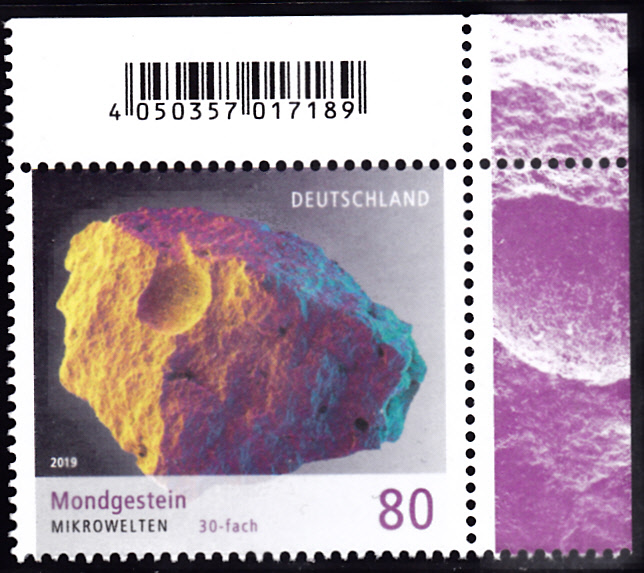 Am 1. Juli 2019 ist bei der Deutschen Post in der Serie "Mikrowelten" auch eine Marke (MiNr 3478) mit einer Abbildung von Mondgestein erschienen. Hier zeige ich ein Eckrandstück mit EAN-Codierung.