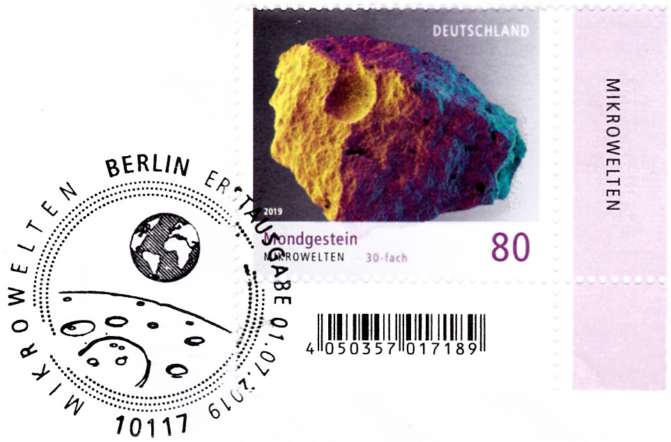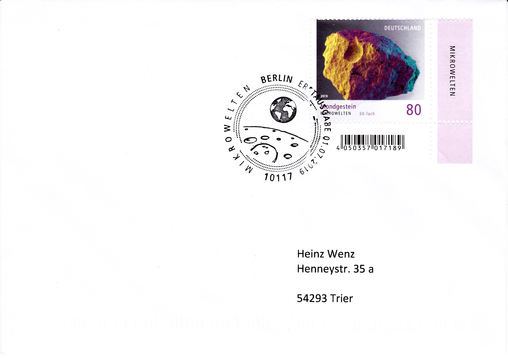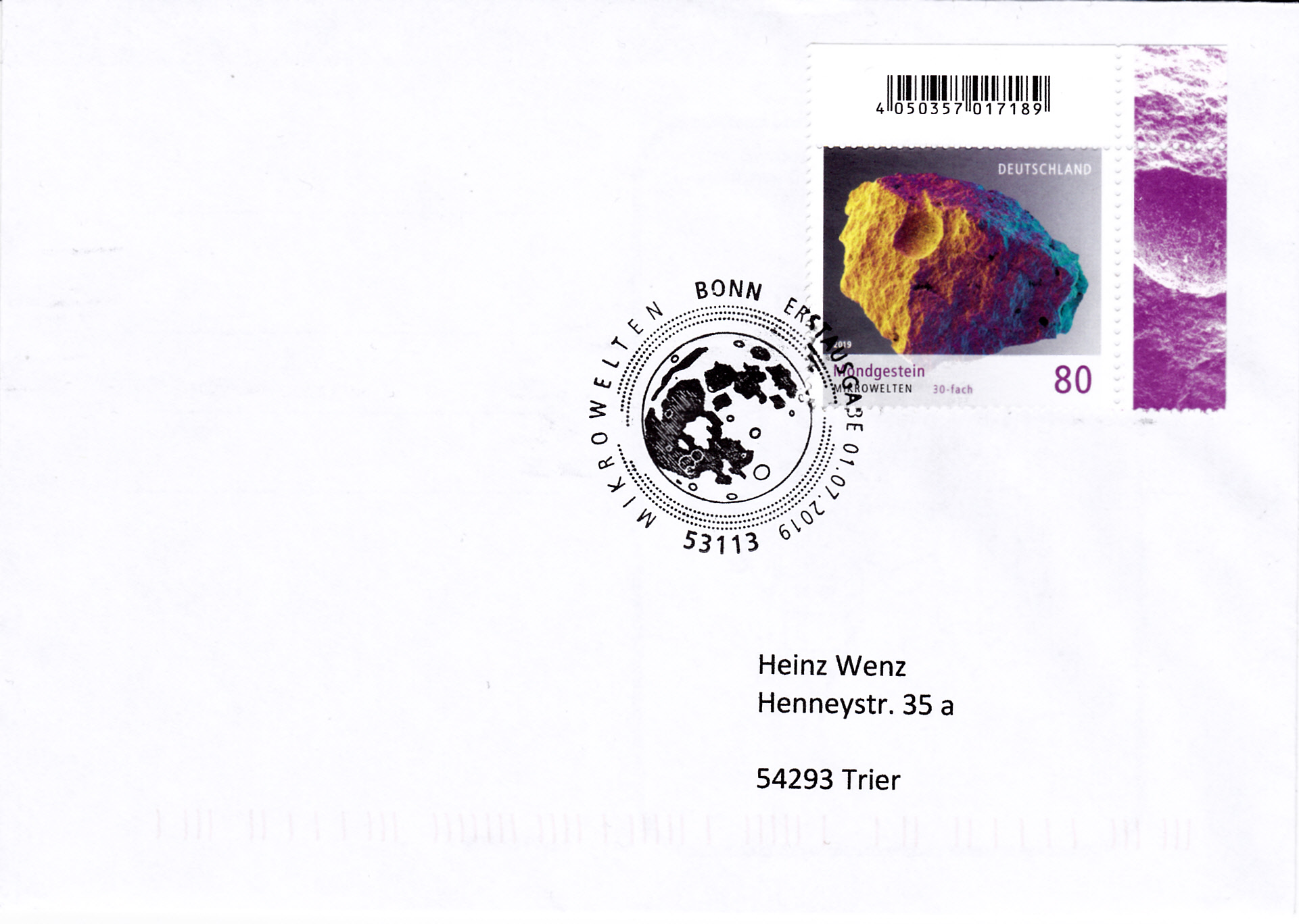 Auf diesem Ersttagsbrief wurde eine Marke der Deutschen Post (MiNr 3478) mit einer Abbildung von Mondgestein mit dem Ersttagsonderstempel aus Bonn gestempelt.