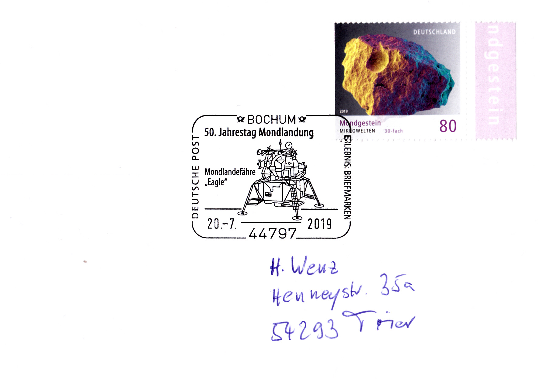 am 20.7.2019 wurde zum 50. Jahrestag der Mondlandung in Bochum ein Sonderstempel mit der Mondlandefähre im Stempelbild geführt.