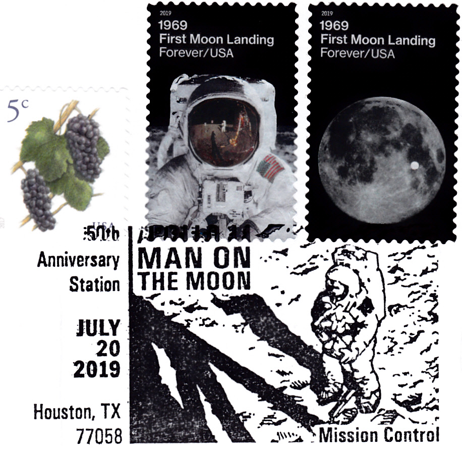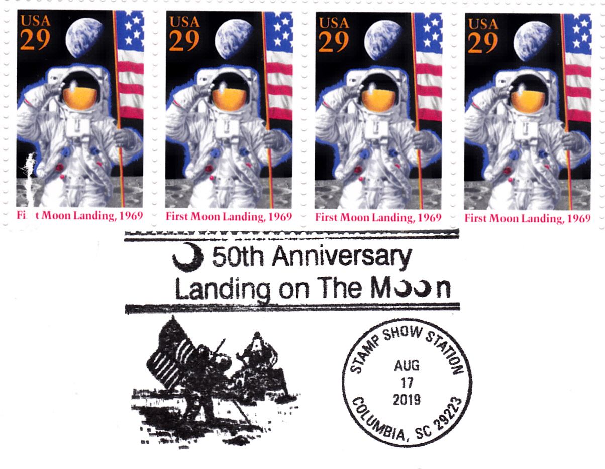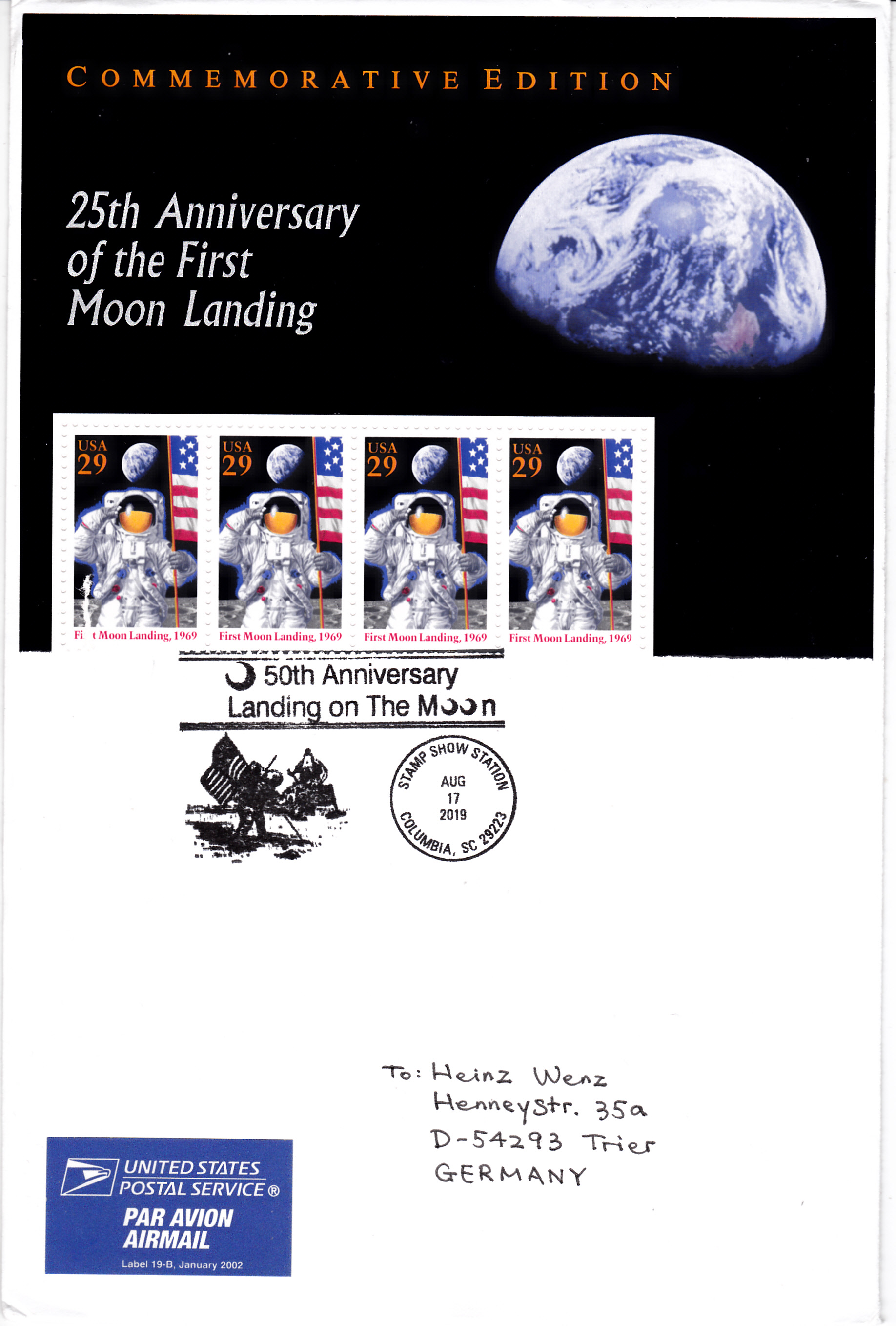 Dieser Sonderstempel vom 17. August 2019 aus Columbia (South Carolina) zum Thema "50 Jahre erste Mondlandung" zeigt die Mondlandefähre und einen Astronauten beim Aufstellen der Fahne der USA auf der Mondoberfläche. Zur Frankatur des Briefes wurden die vier oberen Marken (MiNr 2477) des Schmuckbogen "25 Jahre erste Mondlandung" mit dem dazugehörenden Bogenränder verwendet.