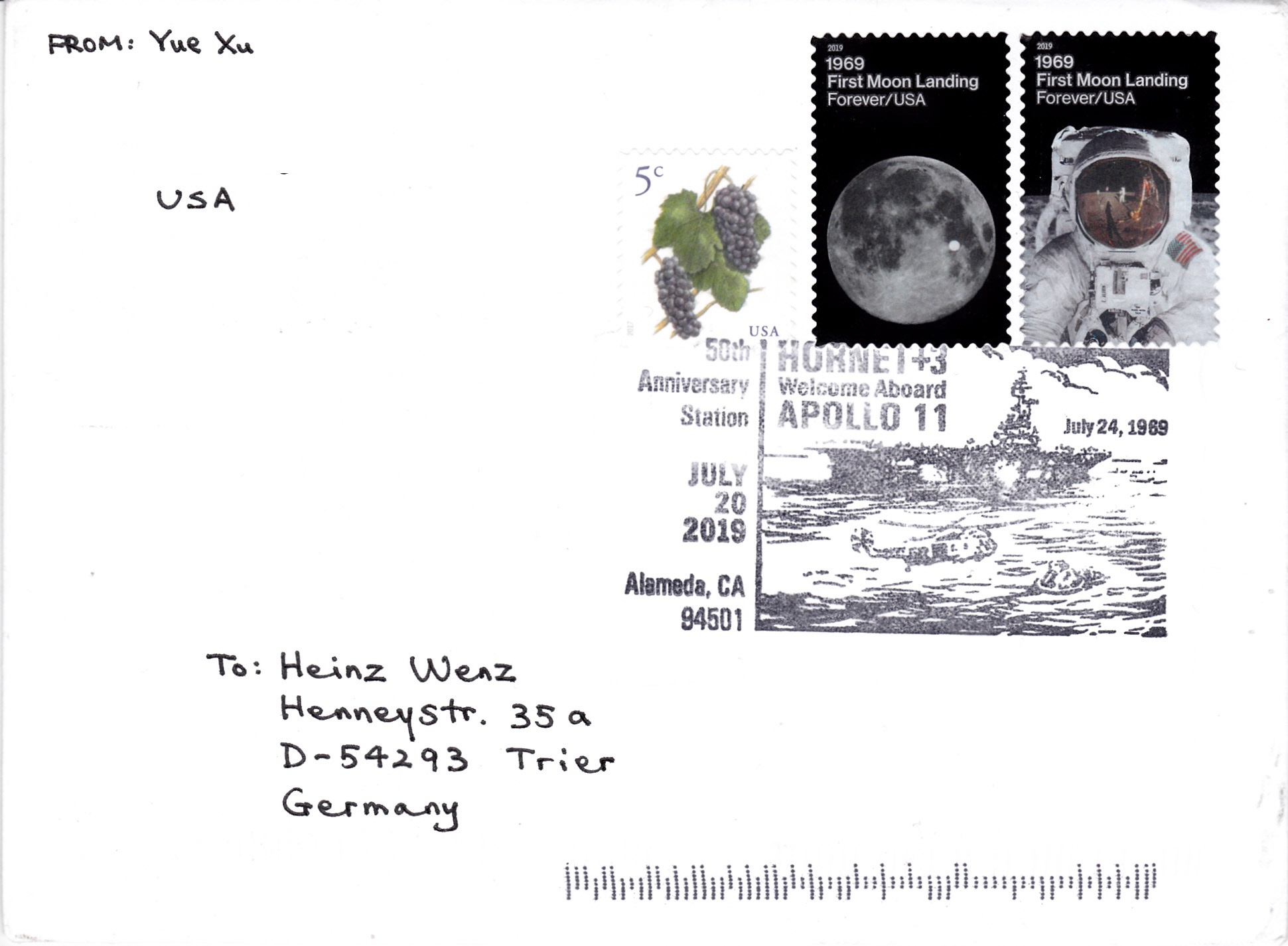 Dieser Sonderstempel vom 20. Juli 2019 aus Alameda (Kalifornien) zum Thema "50 Jahre erste Mondlandung" zeigt die USS Hornet (CV-12), einen Flugzeugträger der Essex-Klasse der United States Navy, bei der Bergung der Apollo 11 Landekapsel. In Almeda befand sich bis 1997 die Naval Air Station Alameda. Auf dem Gelände der ehemaligen Naval Air Station Alameda kann die USS Hornet (CV-12) heute als Museumsschiff besichtigt werden. Zur Frankatur des Briefes wurden die beiden Marken "50 Jahre erste Mondlandung" (MiNr 5536/5537) verwendet. Das Nominale zur Zeit der Ausgabe betrug je 55 Cent.