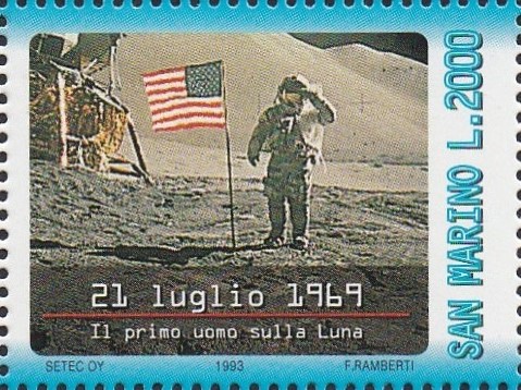 Auf dieser Marke aus San Marino (MiNr 1534) ist auf einem Fernsehbild Neil Armstrong als erster Mensch auf dem Mond (1969) zu sehen.