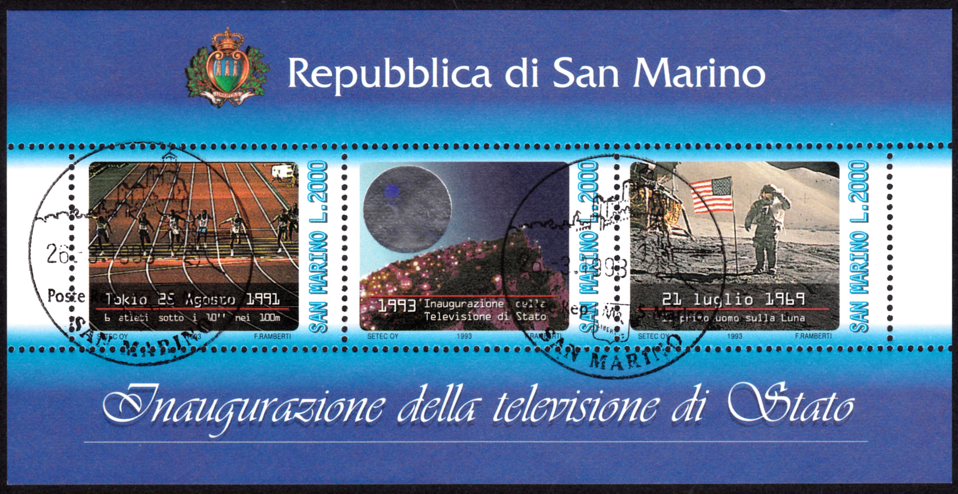 Diese Marke ist zusammen mit zwei weiteren Marken in einem Block (MiNr Block 16) zum Sendebeginn des nationalen Fernsehprogramms San Marinos erschienen. Hier zeige ich auch den kompletten Block.