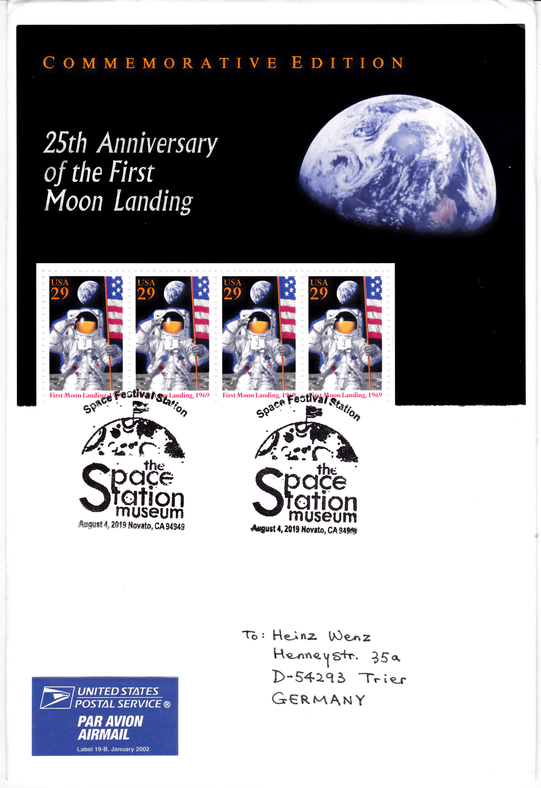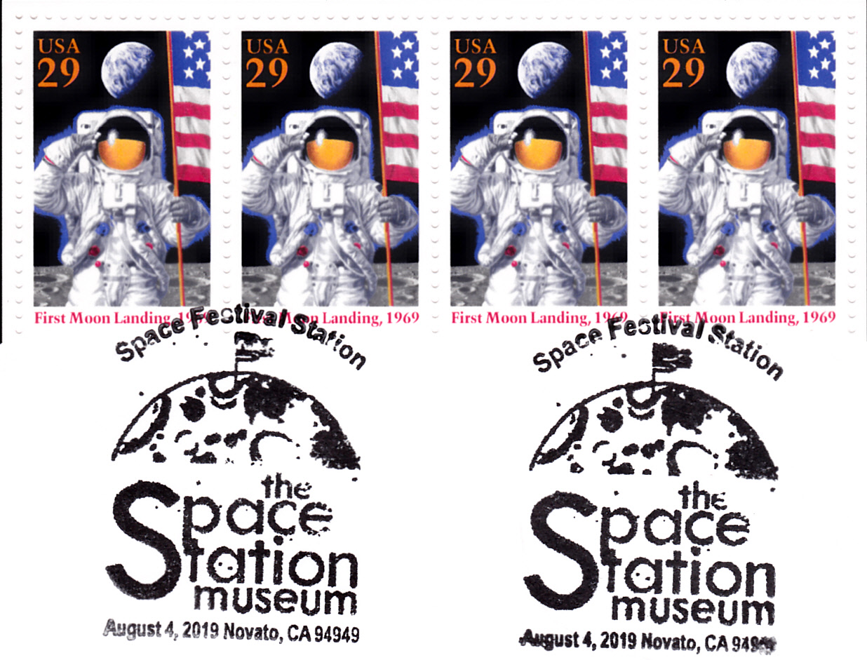 In Novato (Kalifornien) gibt es das Space Station Museum. Zum Novato Space Festival am 4. August 2019 wurde ein Sonderstempel eingesetzt. Als Motiv im Stempel wird eine US-Flagge auf der Mondüberfläche gezeigt. wurden die vier oberen Marken (MiNr 2477) des Schmuckbogen "25 Jahre erste Mondlandung" mit dem dazugehörenden Bogenränder verwendet.