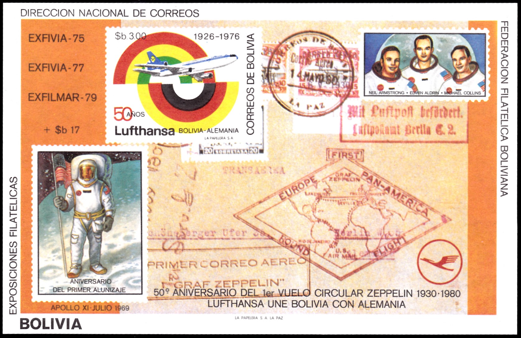 In Bolivien ist 1980 ein weiterer Block (MiNr Block 104) zu dem 50. Jahrestag der ersten Zeppelin-Südamerikafahrt und dem 11. Jahrestag der ersten Mondlandung erschienen. Auf dem Blockrand wird links unten die Mondlandefähre auf der Mondoberfläche abgebildet.