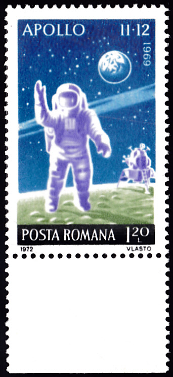 Dieser Satzbrief aus dem Emirat Umm al-Qaiwain zeigt die drei Astronauten, die SATURN V-Rakete sowie die Mondfähre: