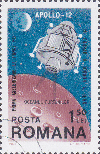 Aus Rumänien kommt diese Marke (MiNr 2809) zur Mondlandung von Apollo 12. Sie zeigt die Mondlandefähre von Apollo 12 und einen Teil der Mondfläche.