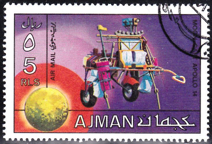In Ras al Khaima ist diese Marke (MiNr 705 A) mit einem Astronauten auf dem Mond und dem Gerätewagen.