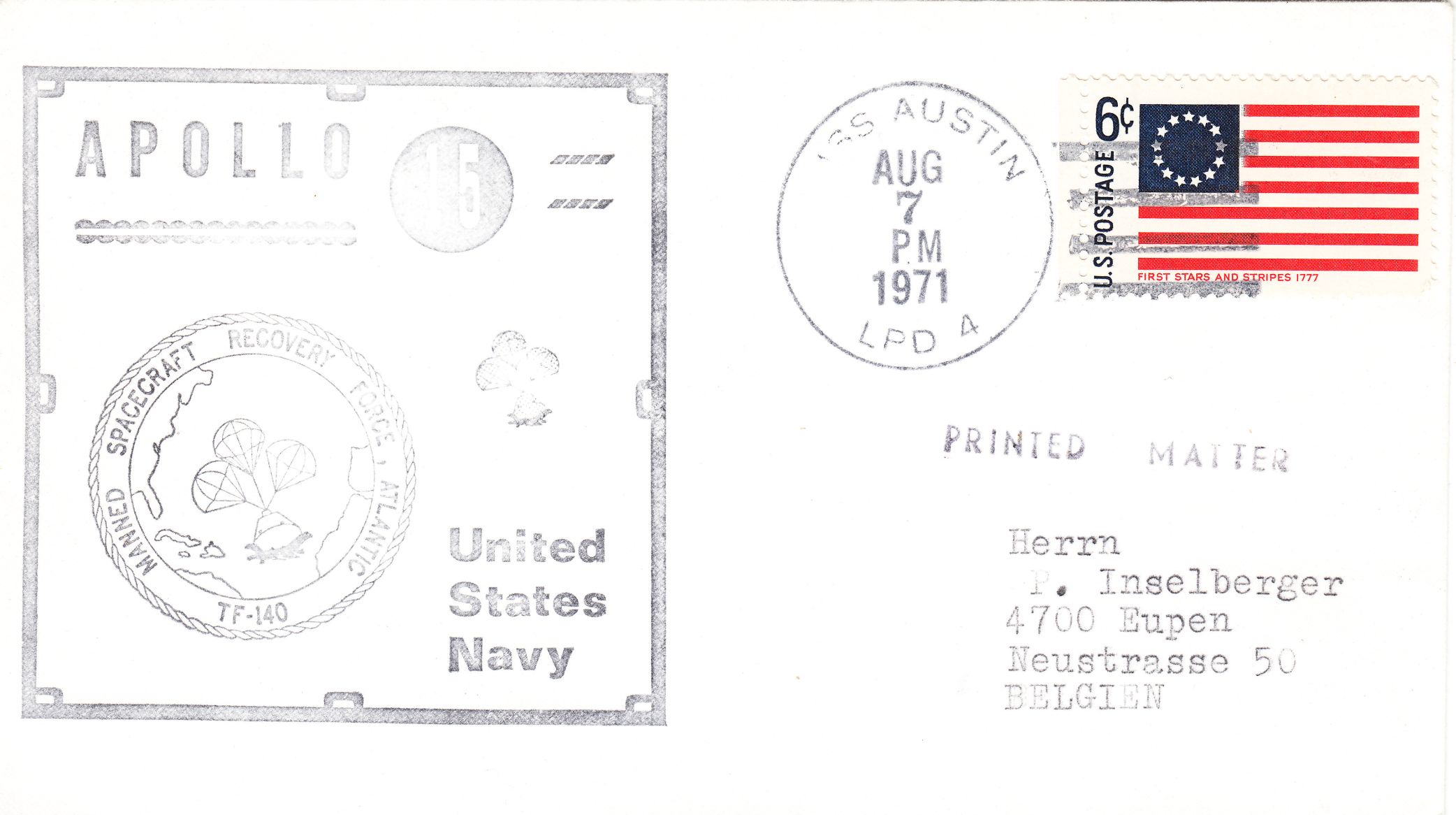 Die Entwertung erfolgte mittels Bordstempel der USS AUSTIN (LPD-4), die am 14.07.1971 in Norfolk auslief, um als Bergungsschiff für ein potentielles Landemanöver von APOLLO 15 im Atlantik zur Verfügung zu stehen.