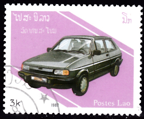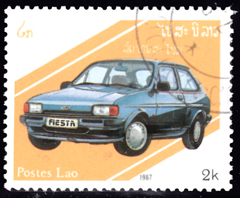 Auf einer Marke aus Laos (MiNr 1012) ist ein Ford Fiesta der zweiten Baureihe (Fiesta ’84 gebaut 1983–1989) abgebildet.
