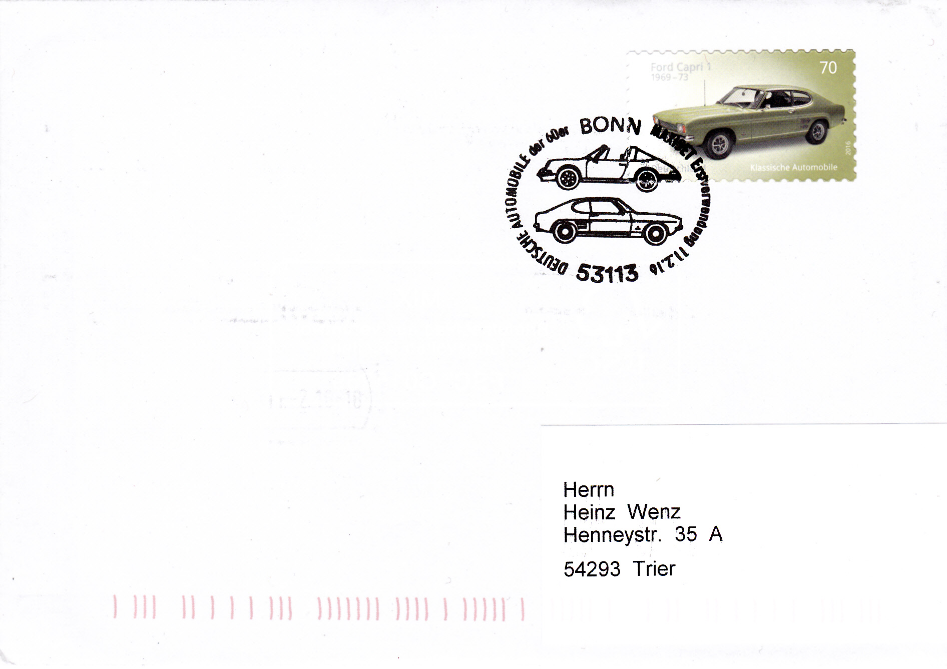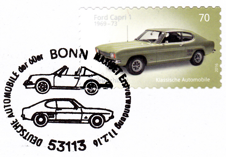 Für die selbstklebende Marke gab es auch einen Erstverwendungsstempel Bonn, der im Stempelbild unten auch einen Ford Capri 1 zeigt.