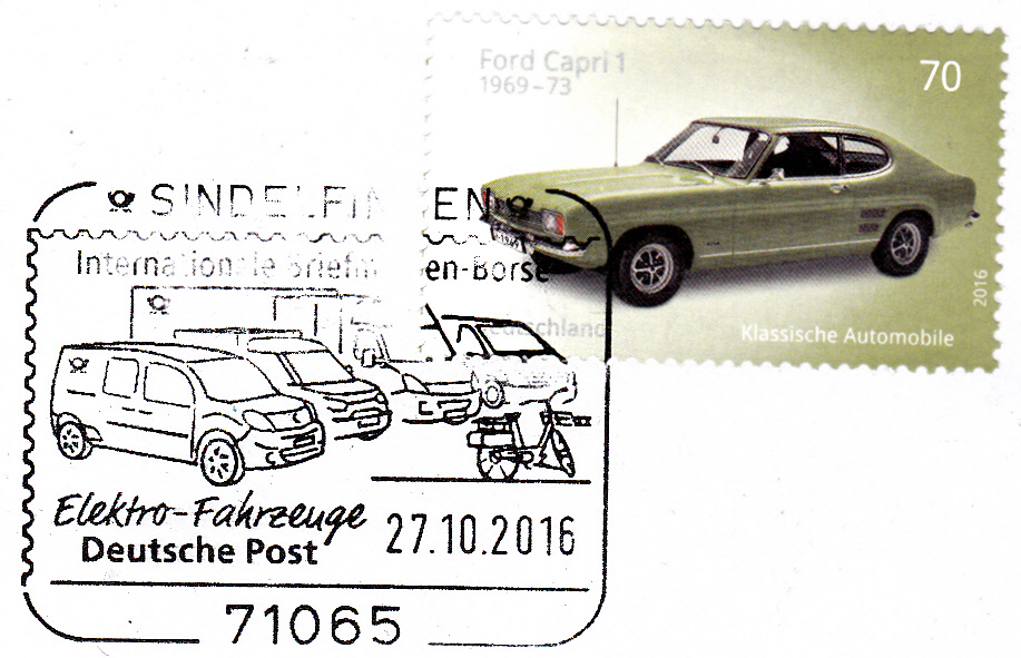 Die Fahrzeuge in diesem Sonderstempel vom 27.10.2016 zur Briefmarken-Börse in Sindelfingen bilden die Elektro-Fahrzeuge der Deutschen Post ab.