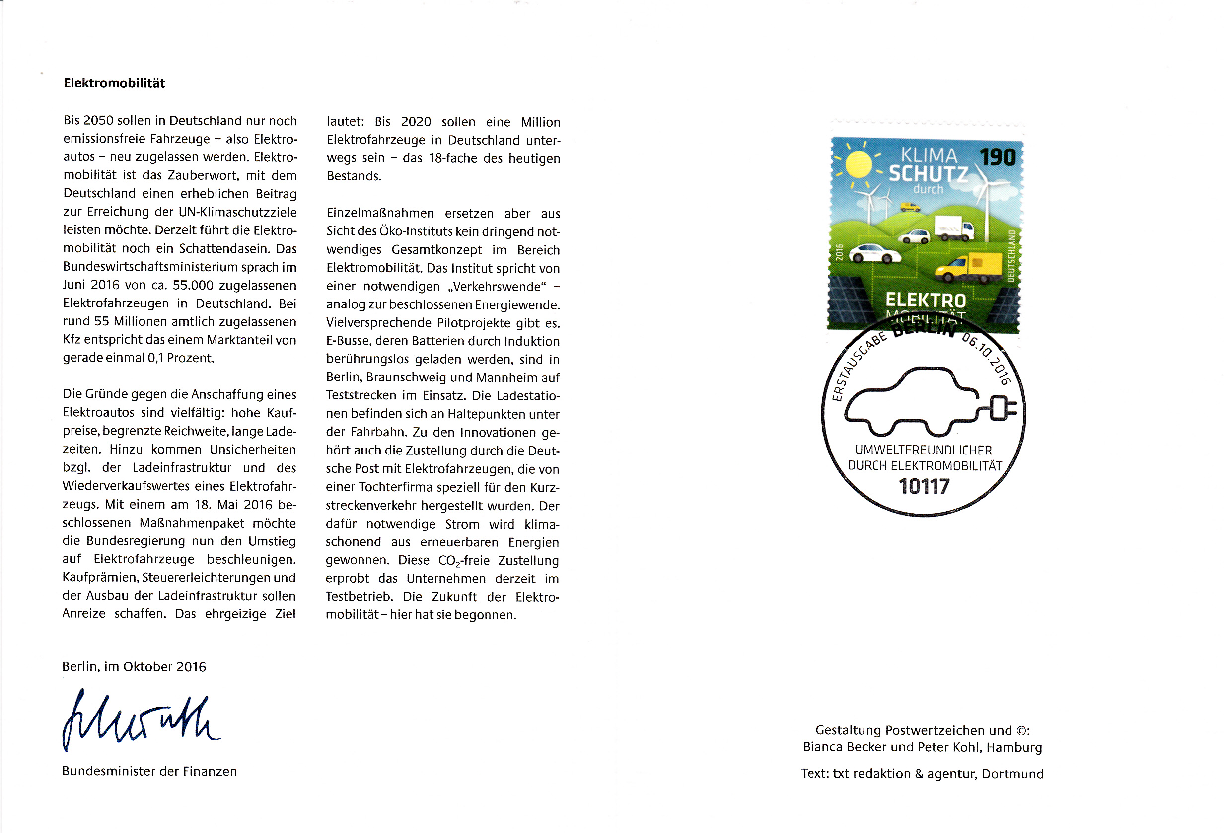Am 6.10.2016 erschien bei der Deutschen Post AG eine Marke zur "Elektromobilität". Die Marke hat zunächst nichts direkt mit dem Thema "Elektro-Fahrzeuge der Deutschen Post" zu tun. In der Ministerkarte des Finanzministers wird im Text auf Seite 2 der Karte aber auf diese Fahrzeuge hingewiesen. Hier eine solche Karte: