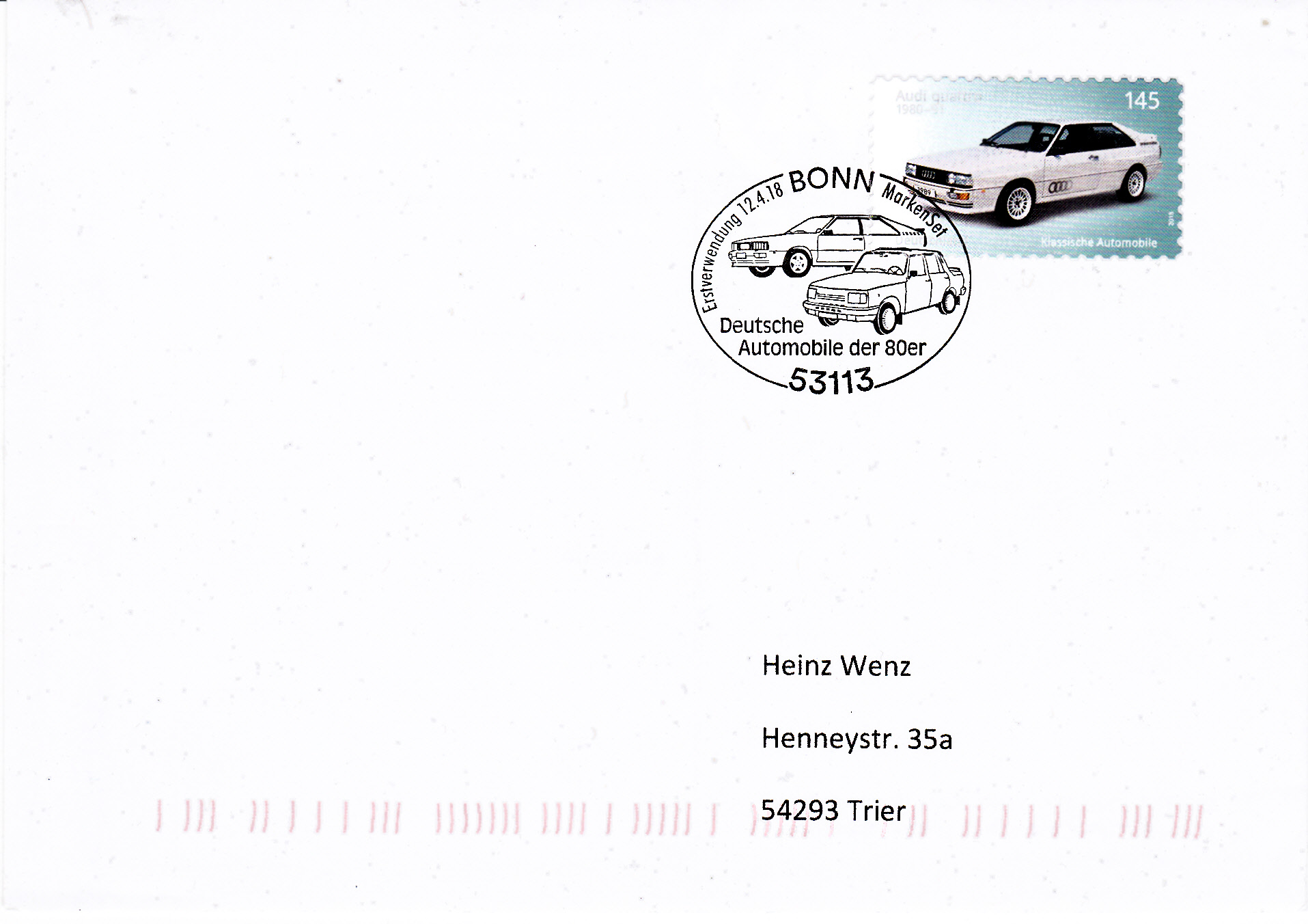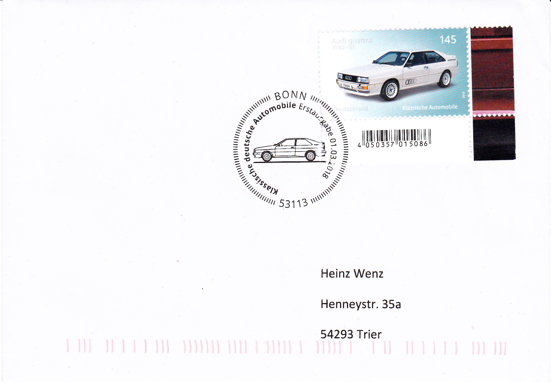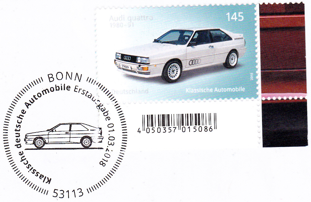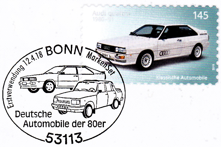 Im Stempelbild des Ersttagsonderstempel aus Bonn ist ein Audi abgebildet. Der Stempel passt daher genau zum Motiv der Marke.