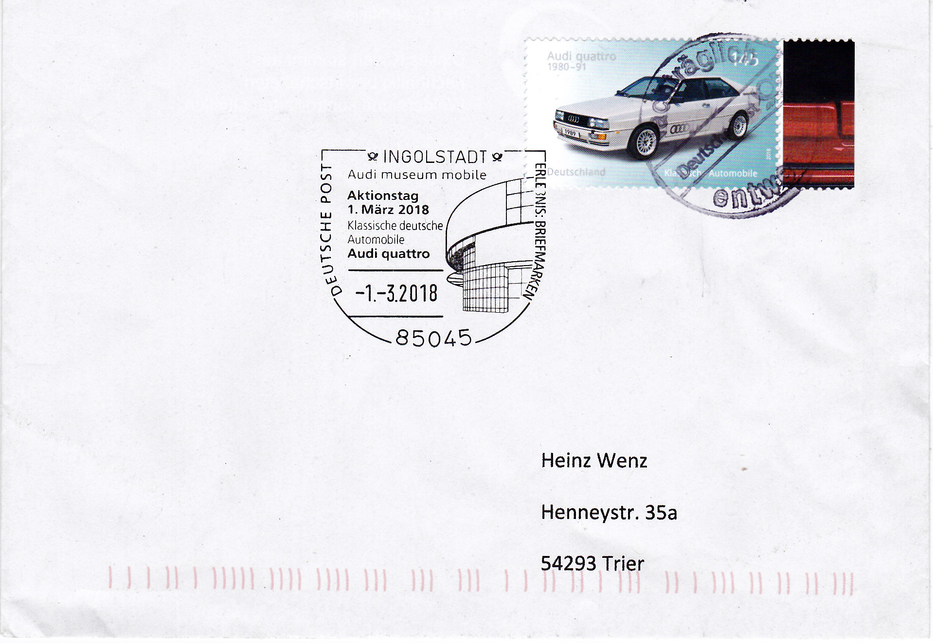 Zu der Marke der Serie "Klassische deutsche Automobile" (MiNr 3367) mit dem Audi quattro gab es am Ausgabetag auch einen passenden Sonderstempel in Ingolstadt. Hier wurde dieser auf einem Brief angebracht. Leider hat ein "übereifriger" Postbediensteter den Stempel übersehen und den Beleg mit einem Gummistempel "Nachträglich entwertet" verziert.