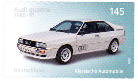 Auch im Erstverwendungsstempel zu der selbstklebenden Marke wird ein Audi quattro abgebildet.