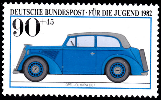 Auf der Jugendmarke 1982 zu 90+45Pf (MiNr 1126) ist ein Modell des eines Opel Olympia aus dem Jahre 1937 zu sehen.