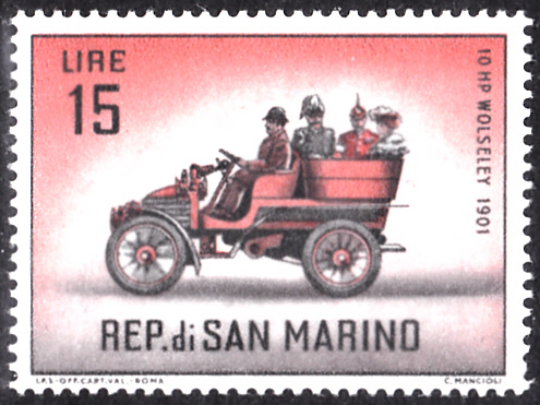 Auf dieser Marke aus San Marino (MiNr 710) wird ein Wolseley 10 gezeigt.