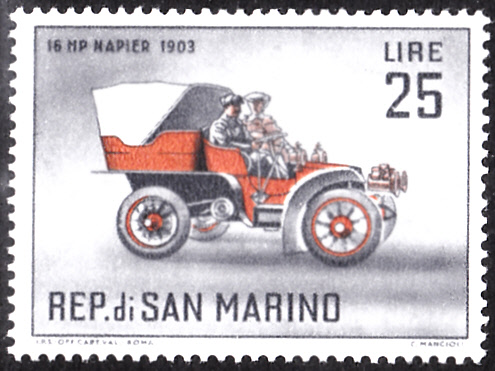 Auf einer Marke aus San Marino (MiNr 712) sehen wir einen 16-PS-Napier aus dem Jahre 1903.