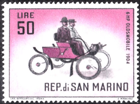 Auf dieser Marke aus San Marino (MiNr 714) ist ein Oldsmobile "Curved Dash" Baujahr 1904 abgebildet.