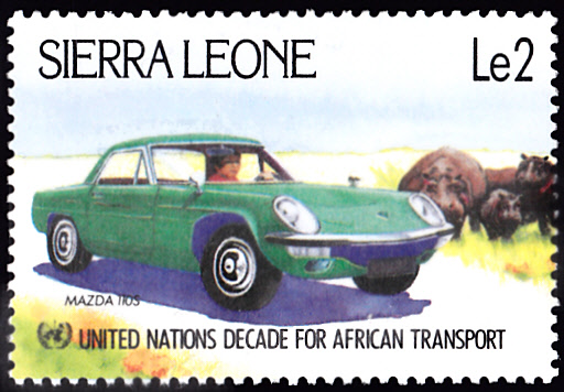 Auf dieser Marke aus Sierra Leone (MiNr 757) wird uns ein Mazda 110 S Cosmo gezeigt.