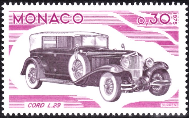 In einer Serie "Entwicklung des Automobilbaus" aus Monaco ist eine Marke (MiNr 1196) mit einem Cord L-29 Baujahr 1929 erschienen.