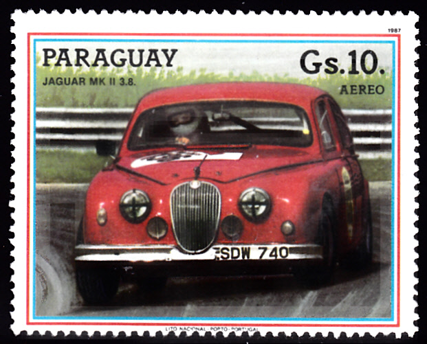 Auf dieser Marke aus Paraguay (MiNr 4092) wird ein Jaguar MK 2 mit einem 3,8-Liter-6-Zylinder-Motor Baujahr 1968-1969 gezeigt.