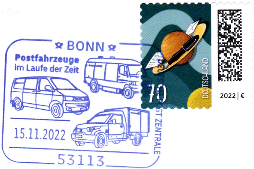 Im Sonderstempel aus Bonn vom 15.11.2022 ist oben rechts ein Mercedes 308 E. 22 zu sehen.