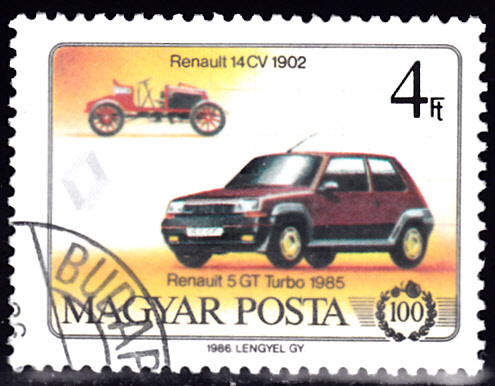 Auf dieser Marke aus Ungarn (MiNr 3731 A) sehen wir einen Renault 5 GT Turbo aus dem Jahre 1985 und oben kleiner einen Renault 14 CV von 1902.