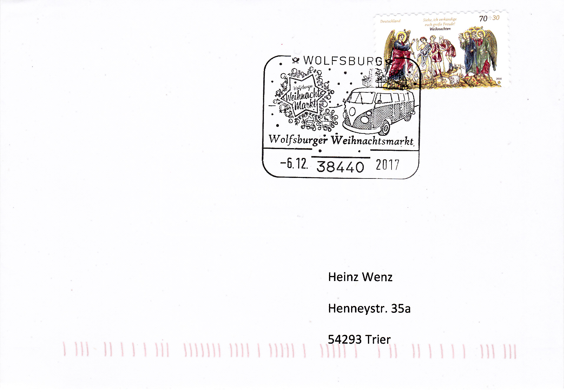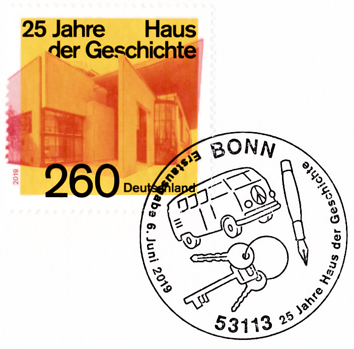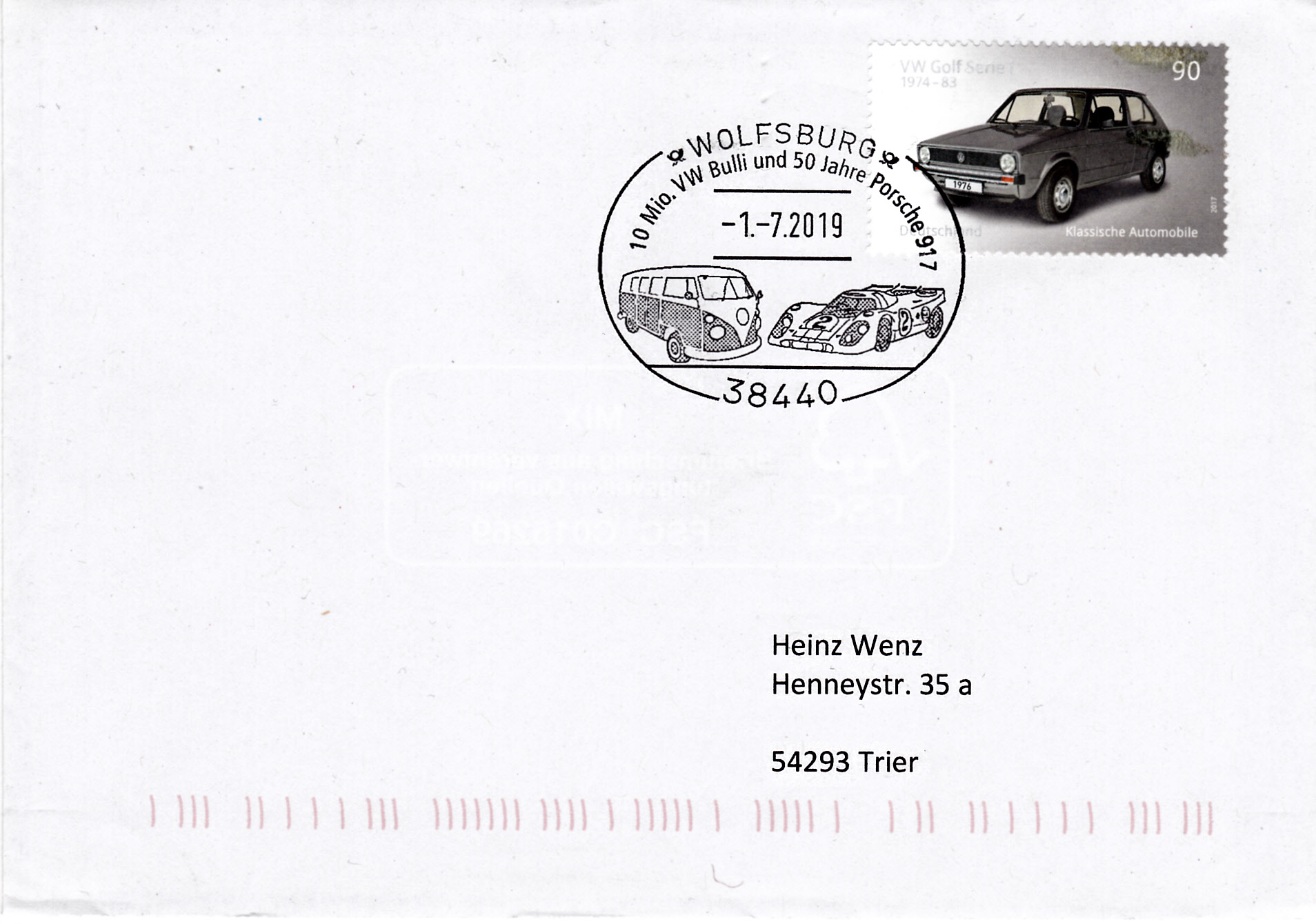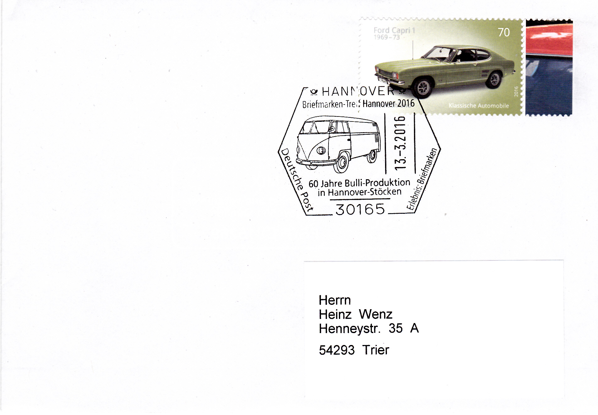Sonderstempel aus Hannover vom 13.3.2016 zum 60. Jahrestag der Verlegung der "Bulli-Produktion" nach Hannover-Stöcken. Im Stempel wird ein VW T1 Kastenwagen gezeigt.