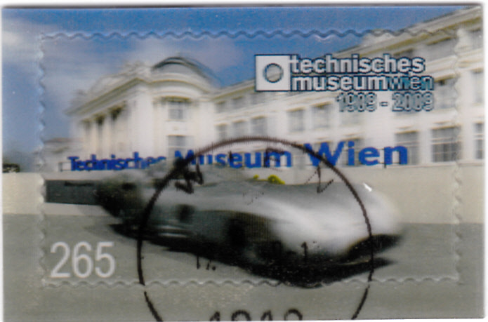 Auf diesem Block aus Österreich (MiNr Block 49 mit Marke MiNr 2795) ist ein Mercedes-Benz W 196 vor dem Technischen Museum Wien abgebildet. Der Block hat einen geriffelten Kunststoffüberzug.