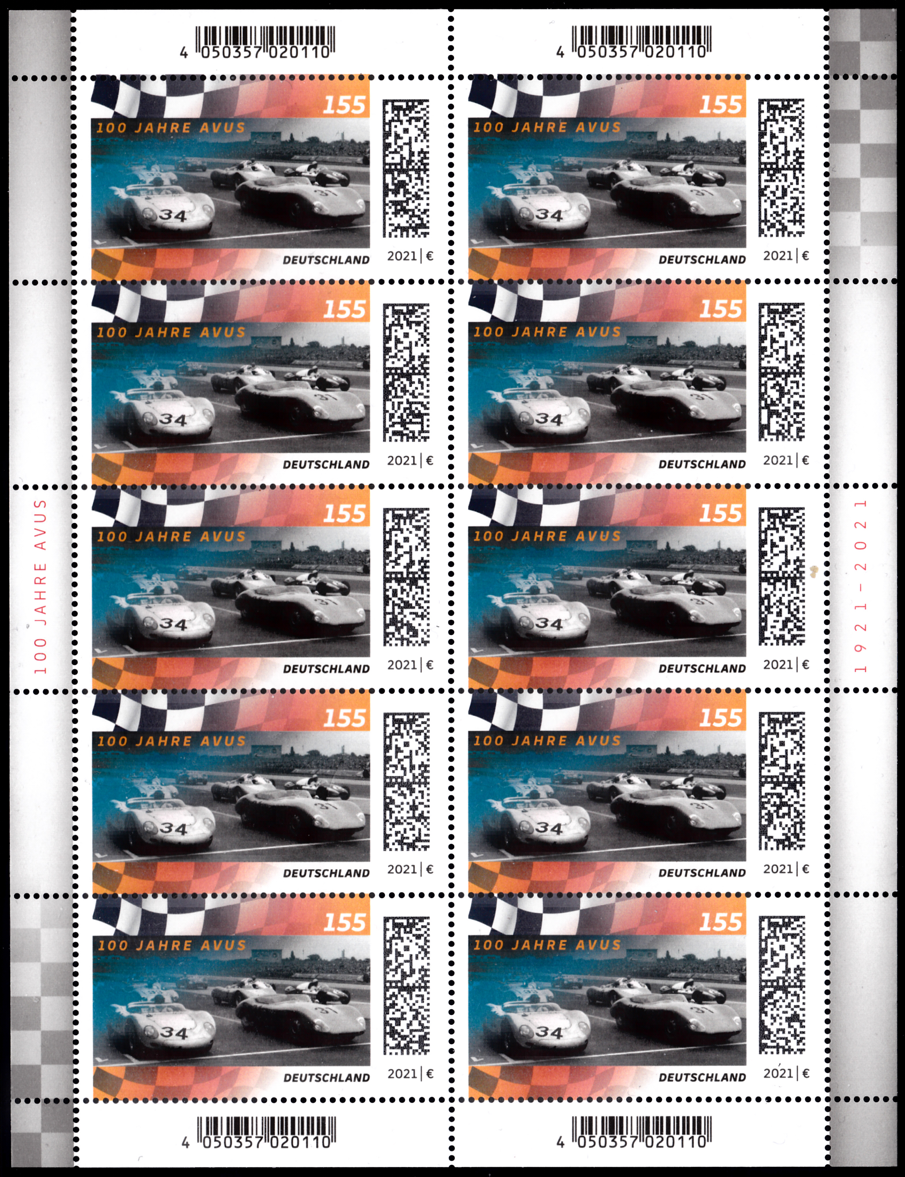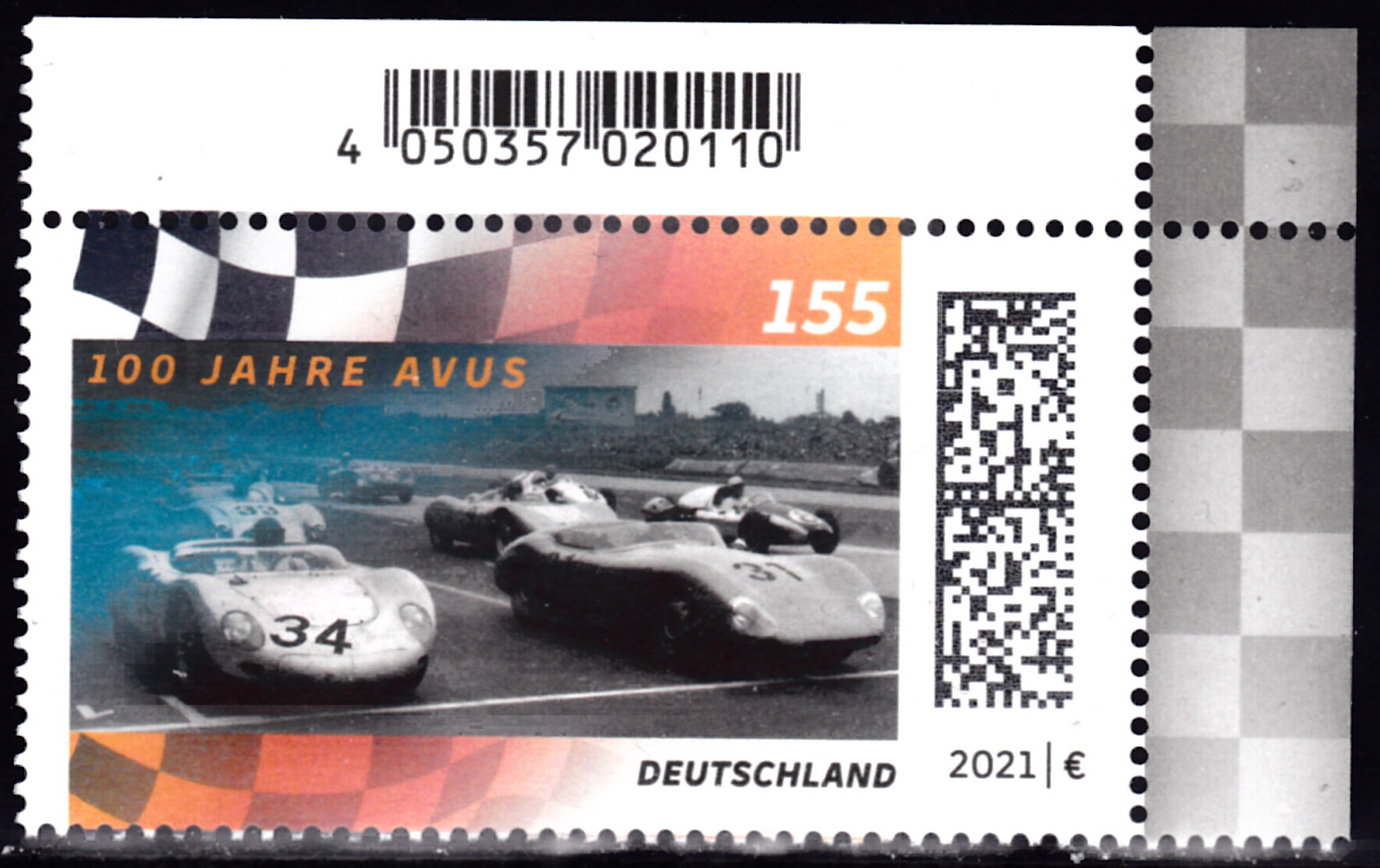 Zum Jubiläum "100 Jahre Automobil-Verkehrs- und Übungsstraße AVUS" verausgabte die Deutsche Post eine Marke (MiNr 3616) mit Rennwagen bei einem AVUS-Rennen in Berlin im Jahre 1958.