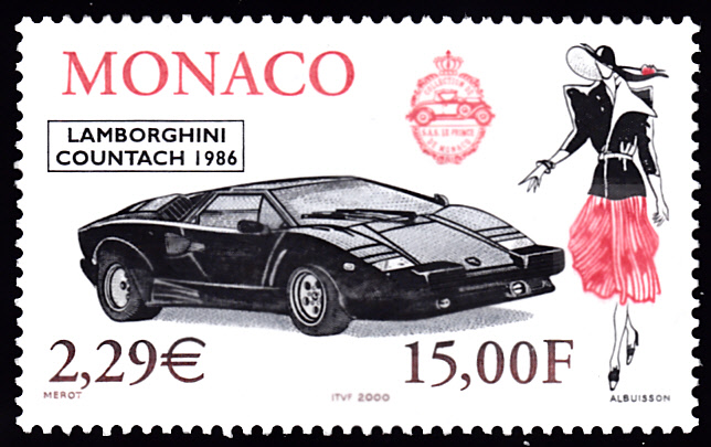 Der Lamborghini Countach ist ein Sportwagen des Fahrzeugherstellers Lamborghini und wurde von 1974 bis 1990 produziert. Diese Marke aus Monaco (MiNr 2513) zeigt einen Lamborghini Countach ais dem Jahre 1986.