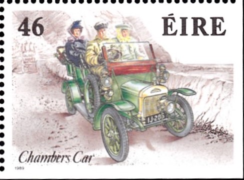 In einer Serie "Irisches Verkehrswesen Historische Automobile" erschien in Irland eine Marke (MiNr 674) mit einem Chambers. Hier zeigen ich eine zweiseitig gezähnte Marke aus einem Heftchen (MiNr 671 E).