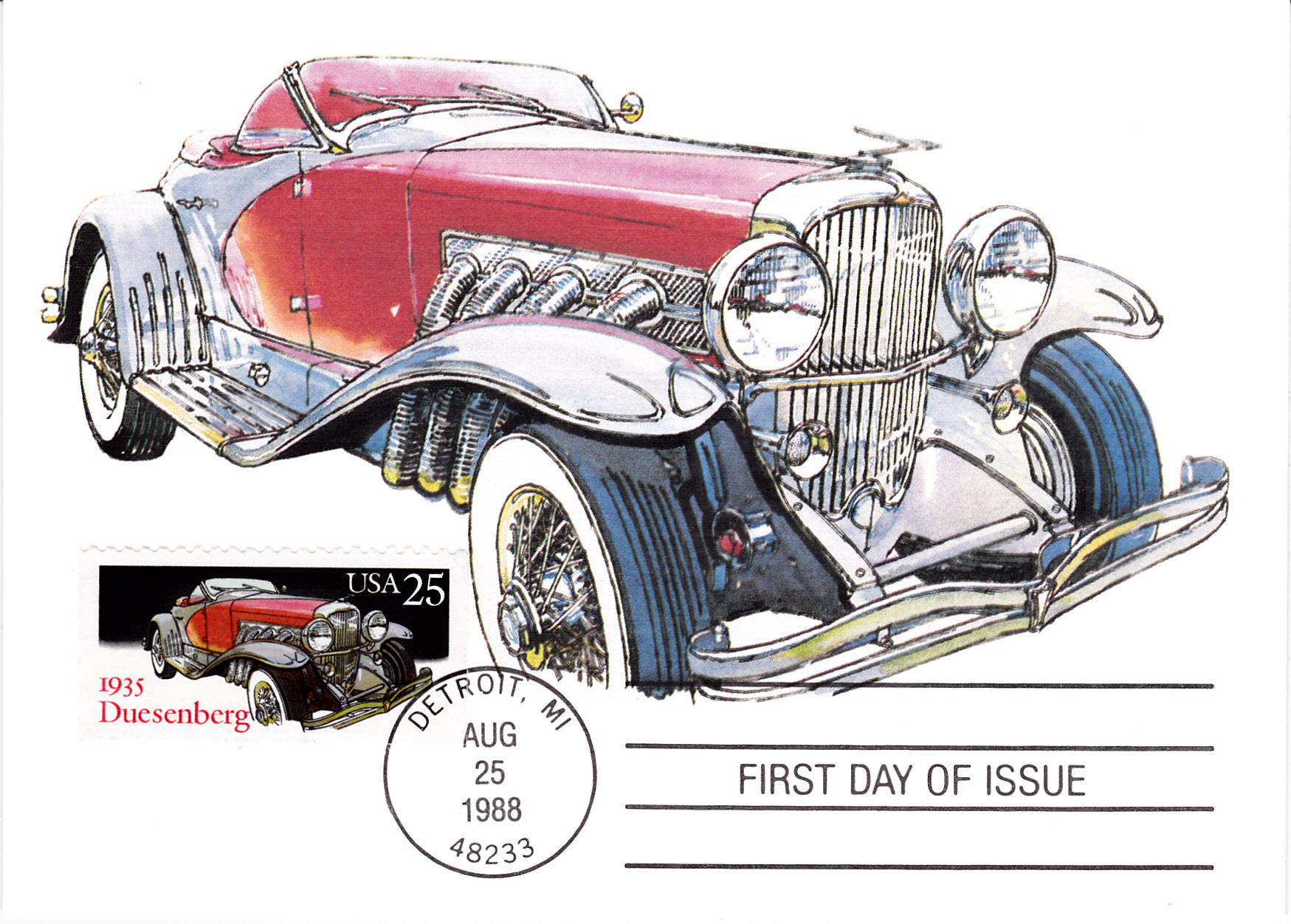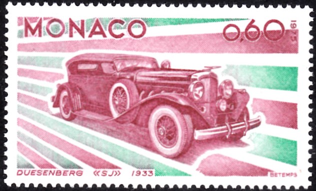 In einer Serie "Entwicklung des Automobilbaus" aus Monaco ist eine Marke (MiNr 1196) mit einem Duesenberg SJ Baujahr 1933 erschienen. Der Duesenberg SJ hatte einen aufgeladenen Motor und brachte es 1932 auf 320 PS und eine Spitzengeschwindigkeit von 243 km/h.