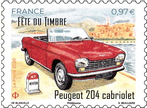Zum Tag der Briefmarke 2020 (Fete du Timbre) erschien in Frankreich eine Ganzsache-Postkarte mit einem Wertstempel im Muster der Marke MiNr 3558 mit einem Peugeot 204 Cabriolet aus dem Jahre 1967.