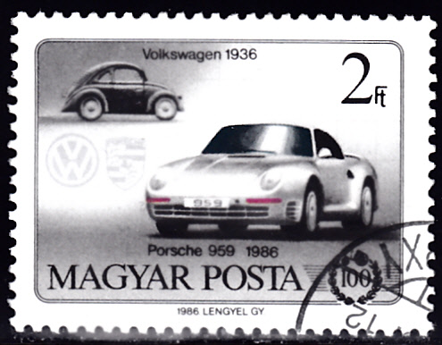 Auf dieser Marke aus Ungarn (MiNr 3830 A) werden oben ein Volkswagen Prototyp VW 30 von 1936 und unten ein Porsche 959 aus dem Jahre 1986 gezeigt.