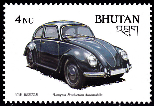 Ais Bhutan kommt diese Marke (MiNr 1064) mit einem VW Käfer. Gezeigt wird ein Modell mit geteilter Heckscheine.