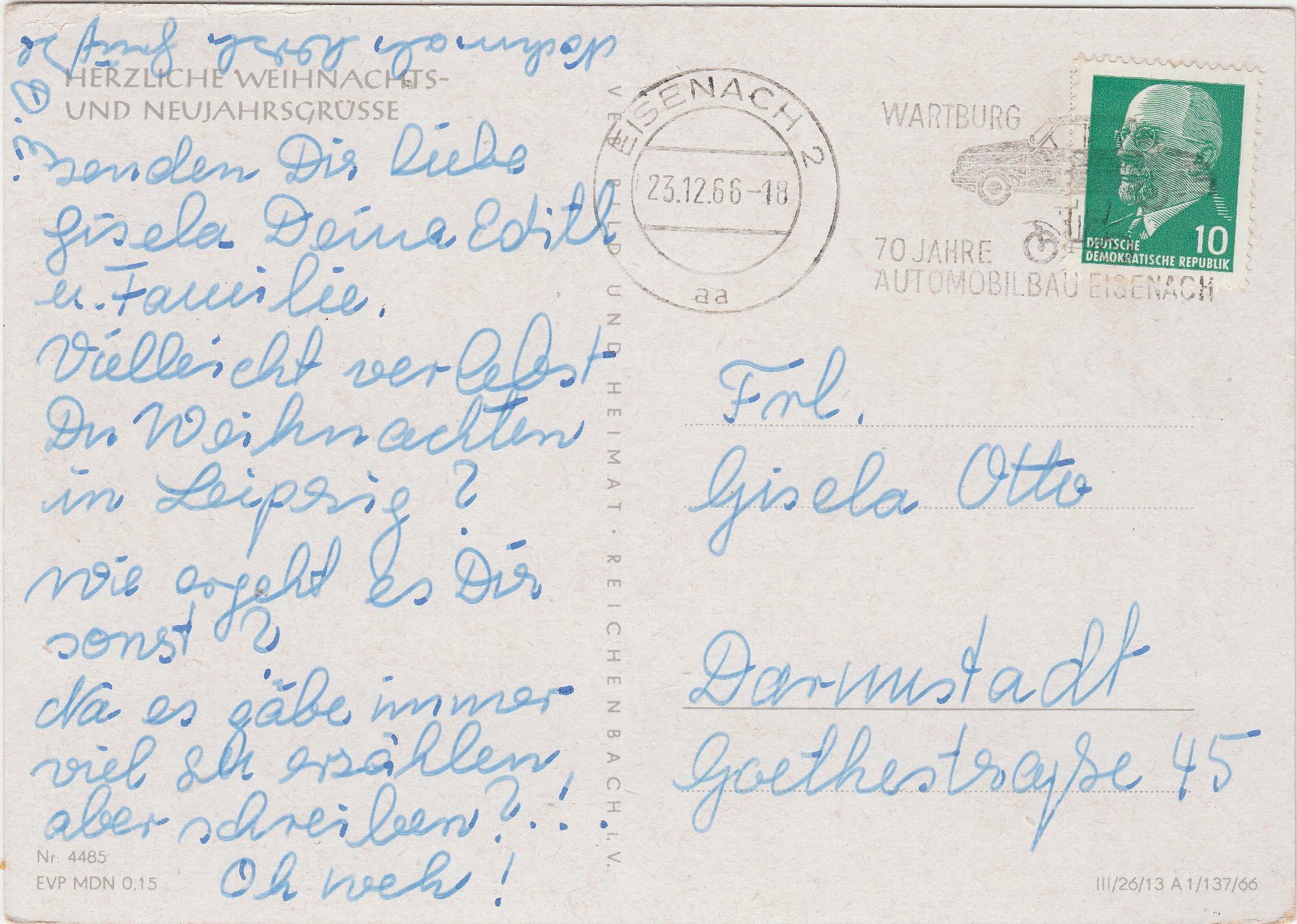 Das Postamt EISENACH 2 nutzte am 23.12.1966 einen Maschinenstempel mit Werbeeinsatz rechts: