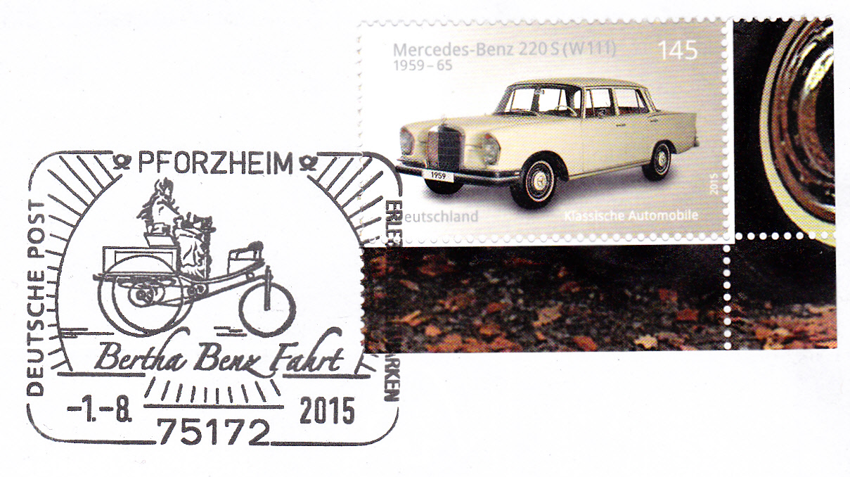 Sonderstempel vom 1.8.2015 zur "Bertha Benz Fahrt", einer Oldtimerfahrt, mit der Abbildung des Logos der Veranstaltung, das Bertha Benz im Benz Patent-Motorwagen Nummer 3 zeigt.