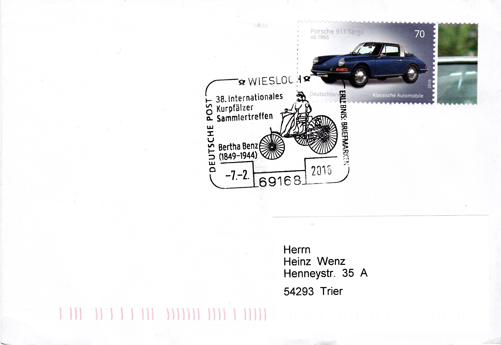 Sonderstempel aus Wiesloch vom 7.2.2016 mit dem Patentmotorwagen Nr. 1 von Carl Benz mit seiner Frau Bertha Benz im Stempelbild.