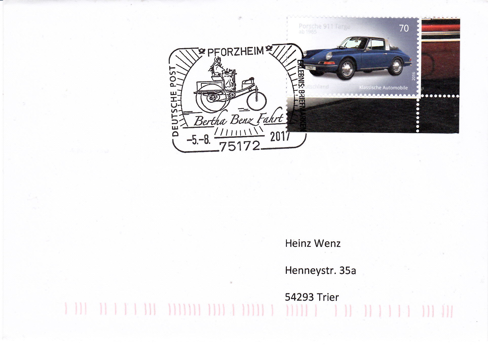 Sonderstempel vom 5.8.2017 zur "Bertha Benz Fahrt", einer Oldtimerfahrt, wird erneut das Logo der Veranstaltung, das Bertha Benz im Benz Patent-Motorwagen Nummer 3 zeigt, verwendet.