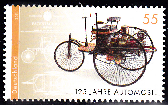 Zum Jubiläum "125 Jahre Automobil" gab es bei der Deutschen Post eine weitere Marke (MiNr 2867) mit dem Benz-Patent-Motorwagen. Im Hintergrund wird die Patentschrift gezeigt.