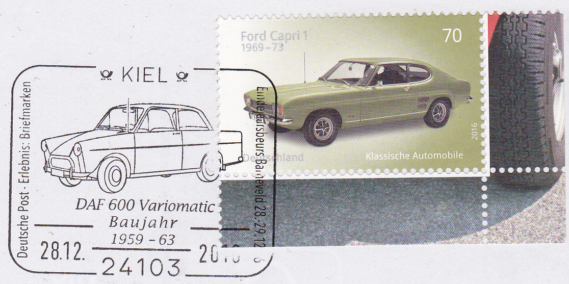 Sonderstempel vom 28.12.2016 aus Kiel mit einem DAF 600 Variomatic. Von diesem Typ wurden 1959 bis 1963 30.591 Fahrzeuge gebaut.