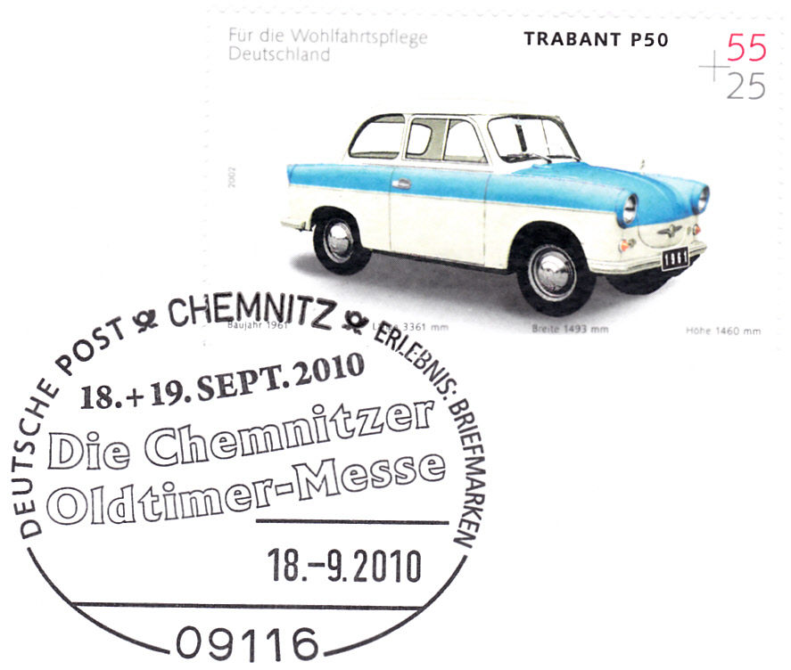 Dieser Sonderstempel aus Chemnitz vom 18.9.2010 zur Oldtimer-Messe passt auch sehr gut zu dieser Marke mit dem Trabant P50.