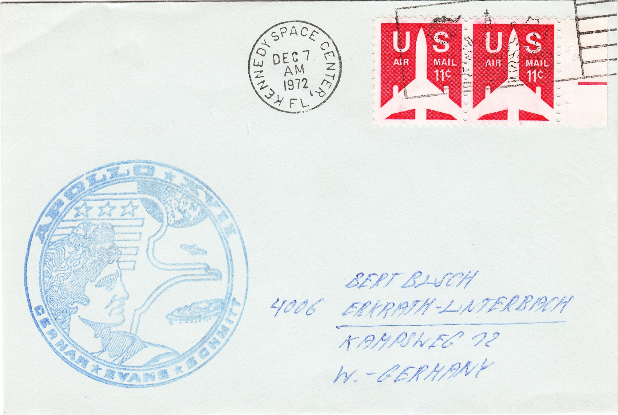 Hier ein Brief mit Cachetstempel der Mission APOLLO 17, gestempelt im KENNEDY SPACE CENTER am 07.12.1972 zum Start der SATURN V-Rakete von APOLLO 17: